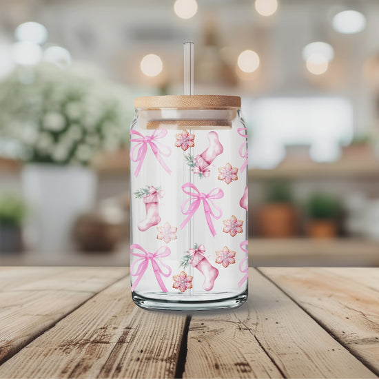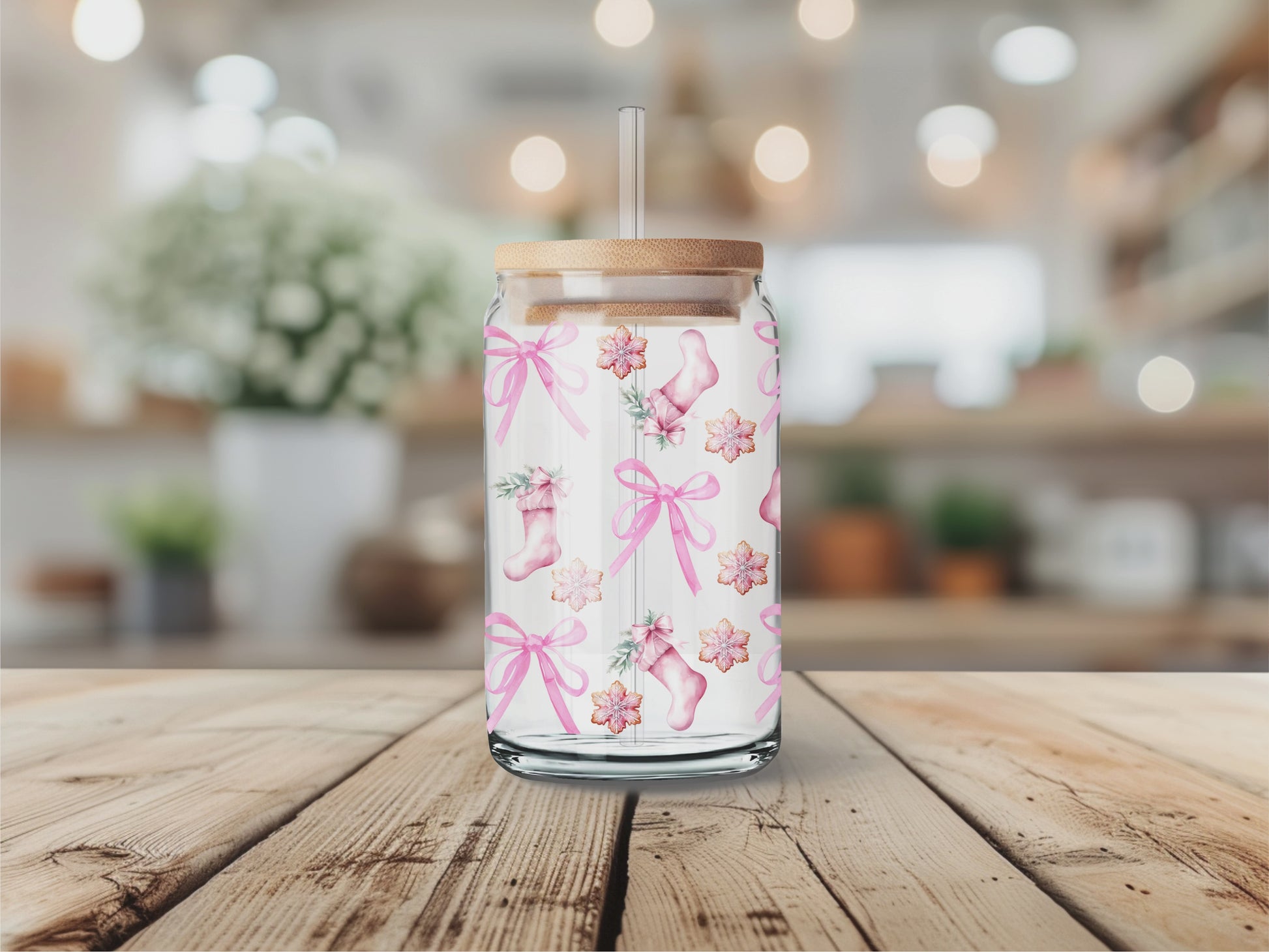 Add a festive touch to your drinks with our Pink Stocking & Bow Frosted Libbey Can Cup 🎀🧦. This 16oz frosted glass is perfect for iced coffee, sodas, mocktails, or holiday cocktails. With its cute pink stocking and bow design, it’s a stylish Christmas gift for friends, family, or yourself!